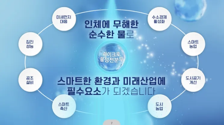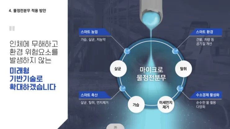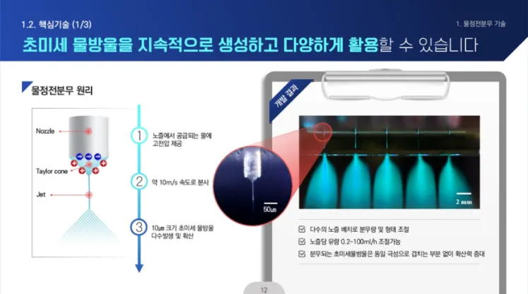 핵심 기술은 코로나19 바이러스 살균, 악취 제거 등 다양한 기능이 있는 초미세 물방울의 대량 생성이 가능하게 하여,