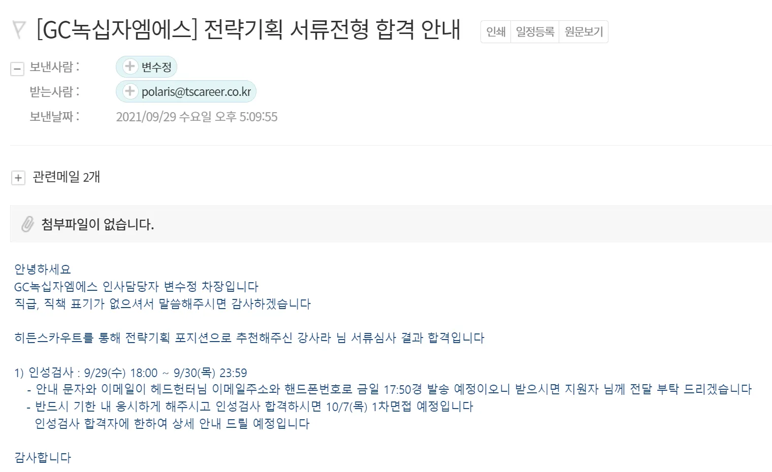 최근 녹십자엠에스 전략기획 서류 전형 합격자 !!