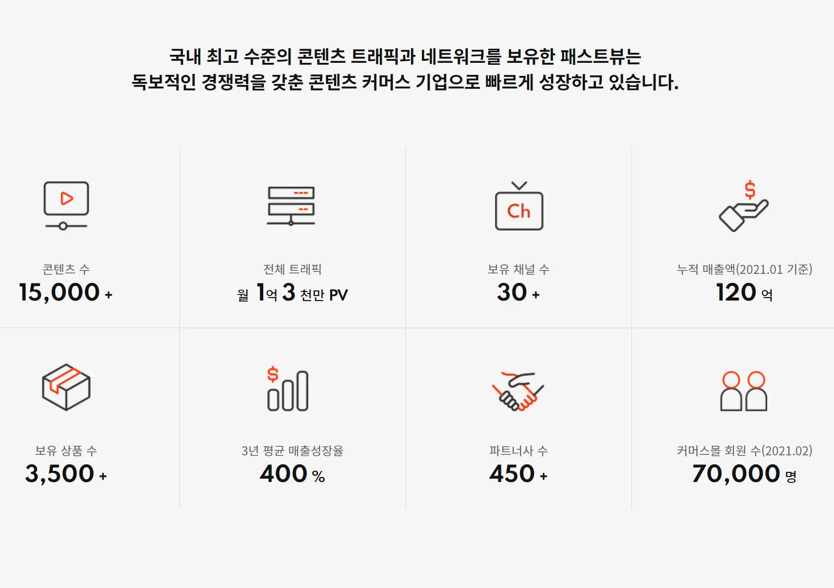 (주)패스트뷰는 콘텐츠 커머스 전문 스타트업으로, 차별화된 소프트 콘텐츠 제작과 유통 역량을 기반으로 다양한 콘텐츠 커머스 서비스 및 온라인 마케팅 서비스를 운영하고 있습니다.